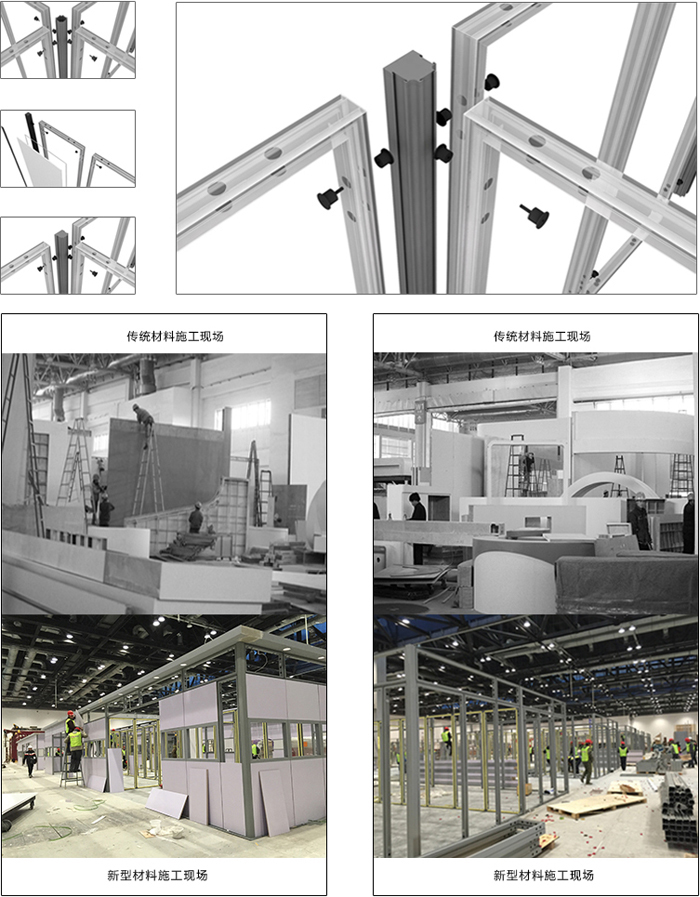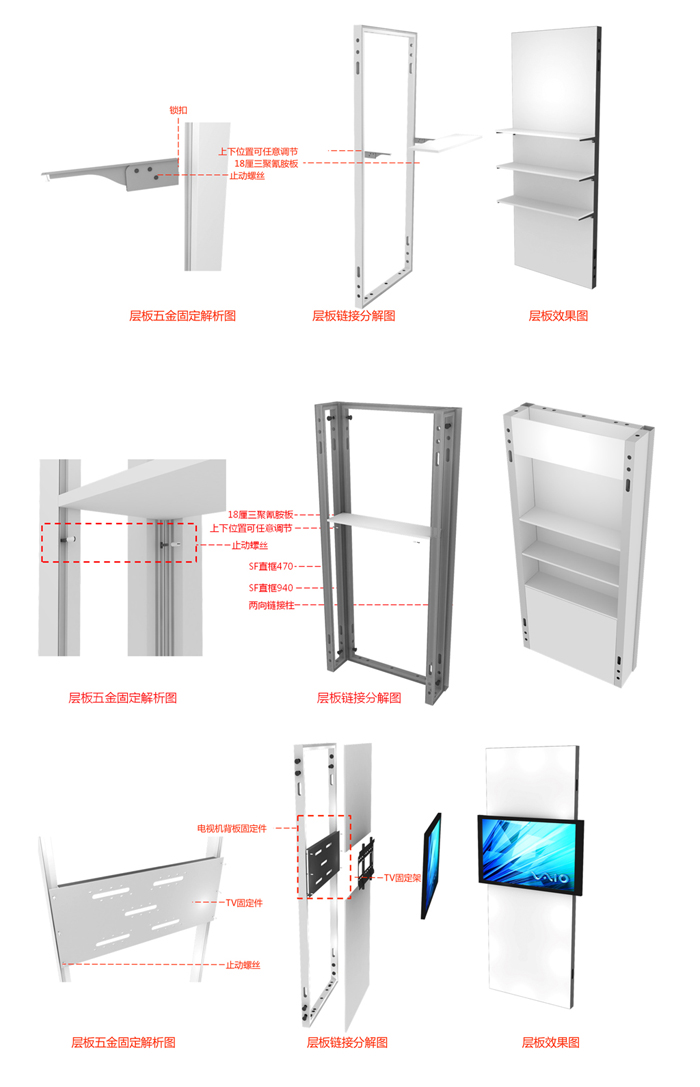 走線纜,框體之間由螺絲鏈接而成,框體外部可粘貼雪芙板畫面、木結(jié)構(gòu)板材及噴繪布及燈箱,可以組合層板、AV設(shè)備及其他沖