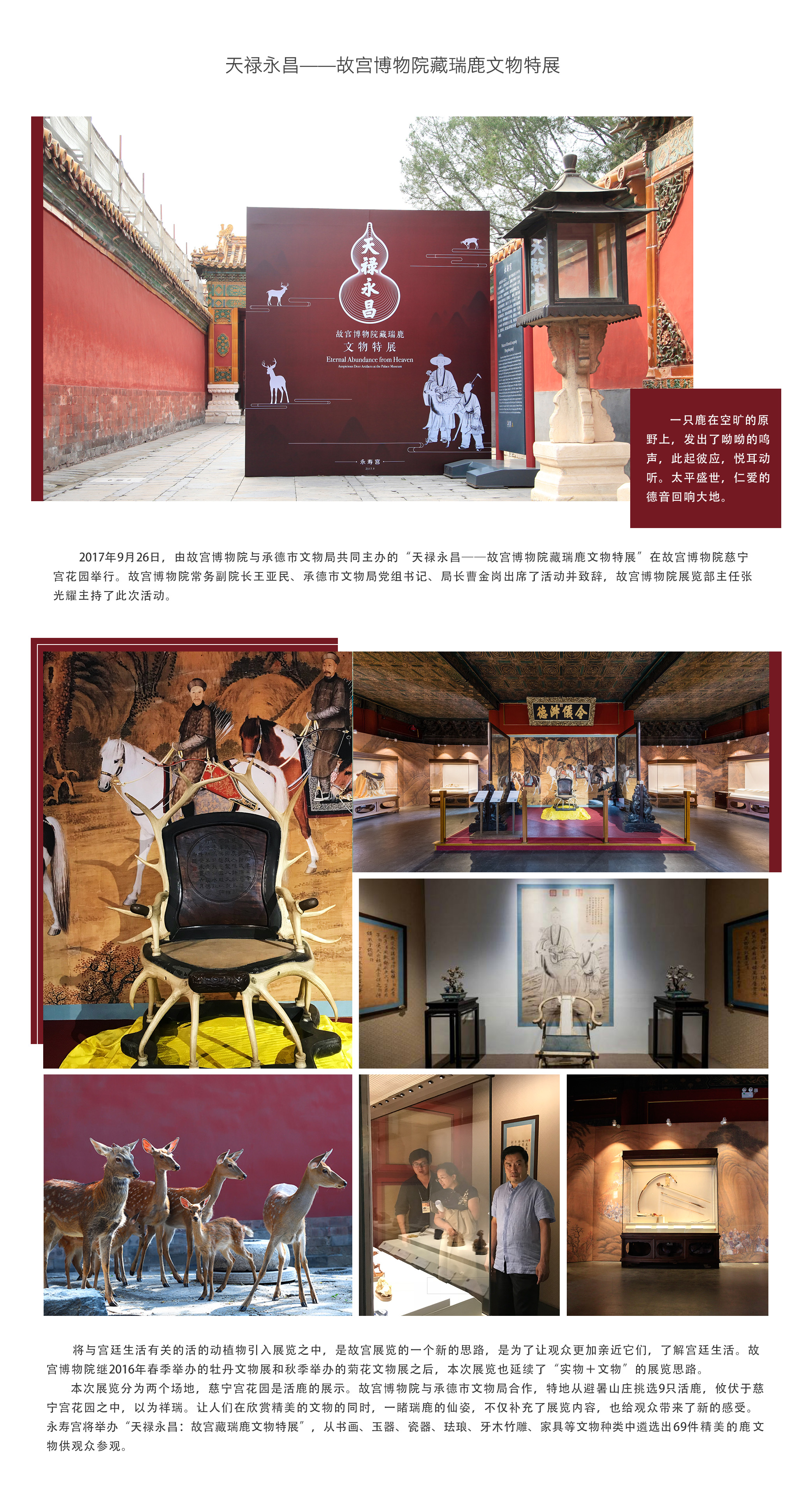 2017年9月26日,由故宮博物院與承德市文物局共同主辦的“天祿永昌——故宮博物院藏瑞鹿文物特展”在故宮博物院慈寧宮花園舉行。故宮博物院常務副院長王亞民、承德市文物局黨組書記、局長曹金崗出席了活動并致辭,故宮博物院展覽部主任張光耀主持了此次活動。