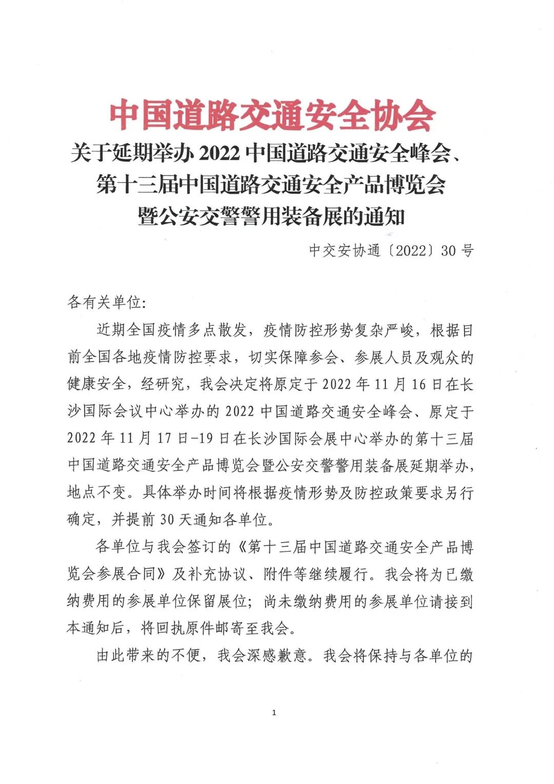 2022中國道路交通安全峰會、第十三屆中國道路交通安全產品博覽會暨公安交警警用裝備展延期通知